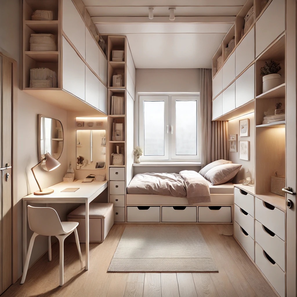 작은 방에서는 하나의 가구가 여러 기능을 수행할 수 있어야 합니다. 수납 기능이 있는 소파베드, 확장 가능한 테이블, 서랍이 있는 침대 등 다기능 가구를 선택하면 공간을 절약할 수 있습니다.